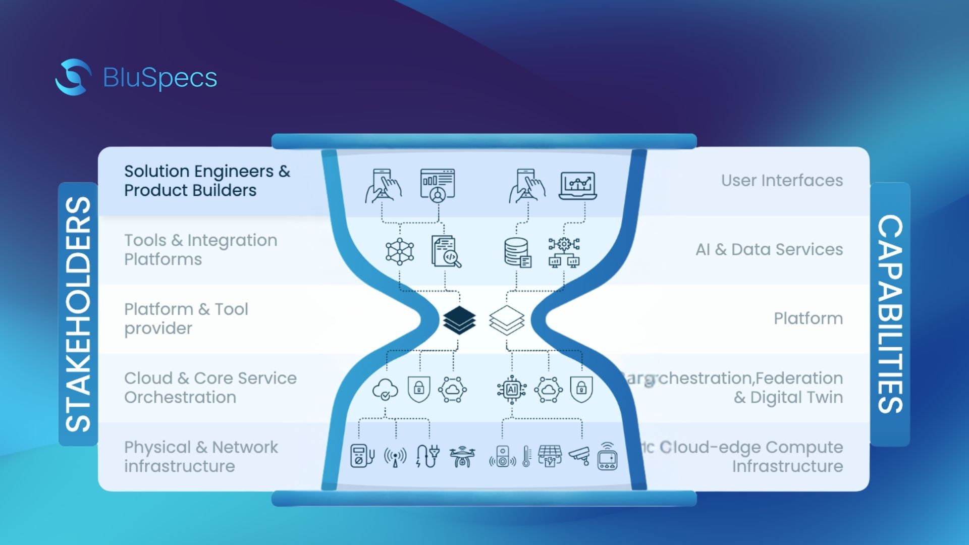 Shaped like an hourglass, it maps how data moves from the physical world to user-facing applications. The narrow “waist” is key: a hub of interoperability and standardisation that connects infrastructure, platforms, and analytics.